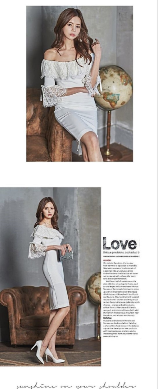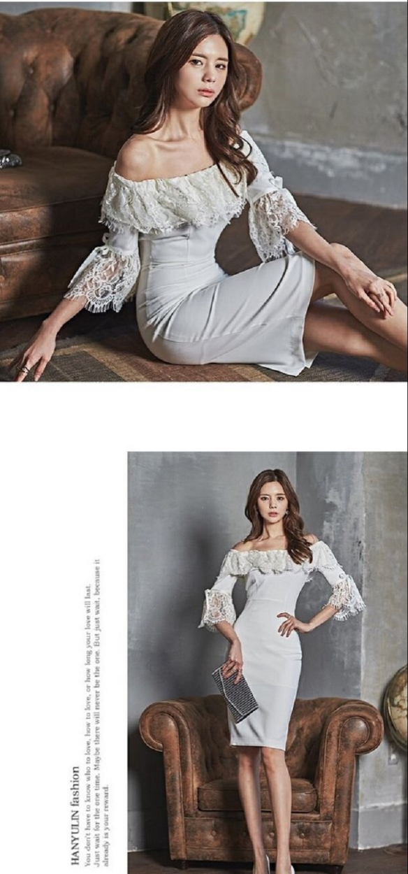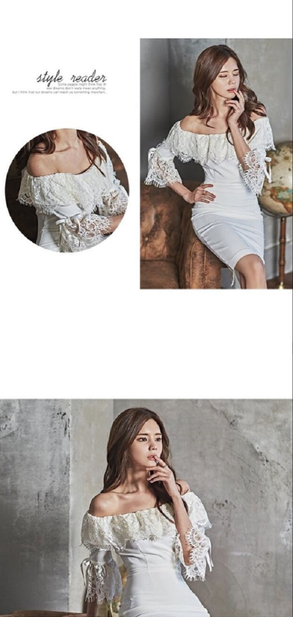 レディース タイト ワンピース オフショルダー 七分袖ベルスリーブ レース ホワイト ドレス パーティー 美ライン