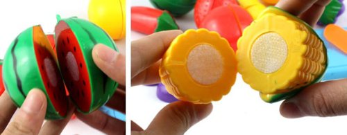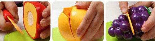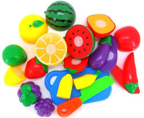 -. Feature : Set (11pcs) includes: Orange, Apple, Watermelon, Corn, Grape, Strawberry, Banana, Eggplant, Chili, Knife, Cutting board / Set of colorful fruit and vegetable toys for your children / Comes with a plastic knife for children to cut the toys of fruit and vegetables / Made of environment-friendly plastic, no harm to kids / It helps develop child's mind, creativity and thinking ability and train their hand-eye-coordination and hand flexibility by their own operation