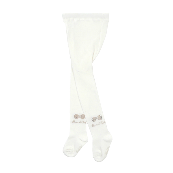 아이보리 골드리본 타이즈입니다. 골드리본을 따라 들어간 진주큐빅 핫피스 장식과 골즈 프랜치캣 로고 자가드 디테일이 있습니다.