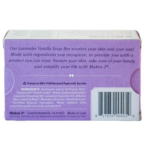 Makes 3 Organics Lavender Vanilla bar soap is made with organic ingredients and hand-crafted in small batches. All of our organic soap packs are made with natural oils and retained glycerin to provide you with soothing moisture.
