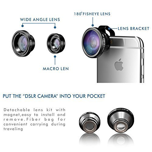 Instant Photographic Versatility Comes equipped to help you take creative and amazing photos right from your mobile phone. This Camera Lens Kit is indeed a practical option. The 180° Fish-Eye Lens+Wide Angle Lens+Micro Lens is both easy to use and effective. The magnetic detachable camera lens is easily transformed. A top-quality and high-grade aluminum design adds aesthetic appeal to your device, providing for maximum results.