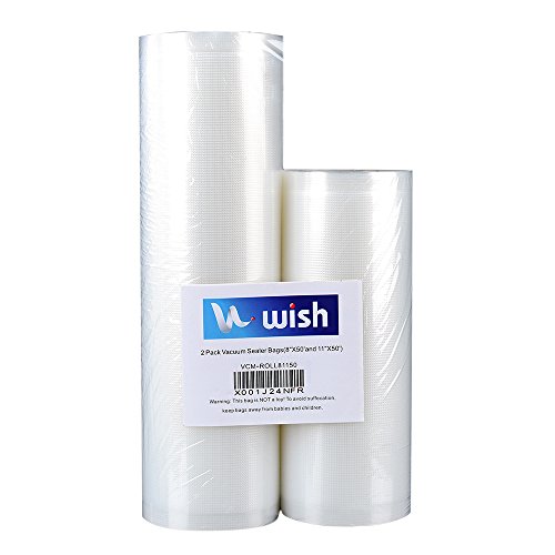 WISH vacuum sealer bags are made of advanced composite material, FDA approved and BPA free. Special structural characteristics innovation offer them ideal vacuum property, they will keep your foods fresh and expand foods lifespan. How to use: •Cut vacuum sealer bag rolls into the size you need •Insert one open end of bag into vacuum sealer machine to seal, MAKE SURE IT'S SEALED PERFECTLY, OR IT COULD NOT BE VACUUMED •Put your food into bag, insert another open end into machine, and start to vacuum seal Features: •FDA approved and BPA free, safety food materials, greatly extend storage time •One side clear, another side embossed -excellent vacuum property, perfect for resale of goods •No markings on bag-Easy writing area for labeling •Boilable •Freezable •Reusable •Microwave Safe •Dishwasher Safe Compatible with most "clamp style" vacuum sealers: •Foodsaver •Seal-A-Meal •Black & Decker •Weston •VacMaster •Rival •Deni •Kenmore •George Foreman •Cabelas •and many more Warranty: 30-Day Money Back GuaranteeFeature