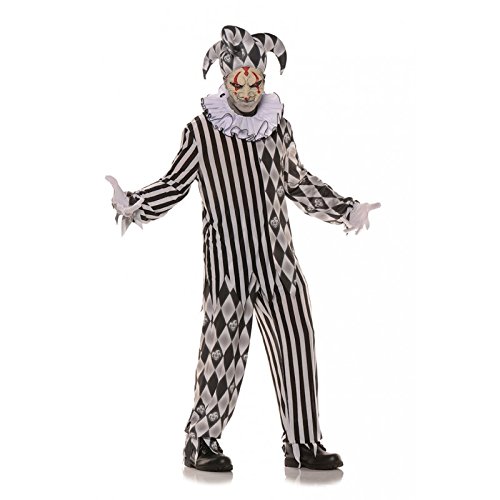-. Feature : Long sleeve two tone printed tunic with shredded cuff detail. Half striped half diamond checkered print. Diamond print features tiny evil harlequin designs. / Matching pant with shredded bottom cuffs / Classic ruffled collar and matching hat. / Available in OS, and XXL. See size chart for reference. / Ideal for stage performances, costume parties, Halloween and more!