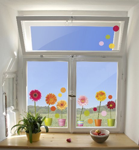 This Gerberas window sticker set features lovely potted flowers of the Gerberas variety. Gerberas are the South American and Asian cousins of the daisy distinguishable by their size and color. These pleasant window stickers will add color and vibrance to your home, just apply to any window. This sticker set come with two 12.2-Inch by 12.2-Inch sheets.