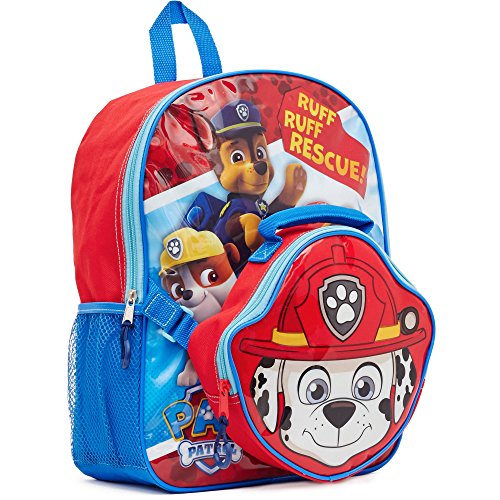 -. Brand : Nick Jr -. Color : red -. Department : boys -. EAN : 0758149658445 -. Feature : Paw Patrol backpack and lunch kit featuring one of the most popluar characters- Marshall. This red and blue backpack has the up close art of Marshall with the detachable backpack matching back to the backpack. It is ideal for organizing books, binders, folders and other school supplies and it also features mesh side pockets to carry water or other drinks and snacks. Padded curved shoulder strap for additional comfort. 16"H x 12" W x 5" deep for backpack and lunch it is 7"H x 9" W x 2.5"D -. Label : unknown -. Manufacturer : unknown -. MPN : 0758149658445 -. PartNumber : 0758149658445 -. ProductGroup : Apparel -. ProductTypeName : LAGE -. Publisher : unknown -. Size : LARGE -. Studio : unknown -. Title : Paw Patrol 16" Backpack with Lunch Kit -. UPC : 688955847880