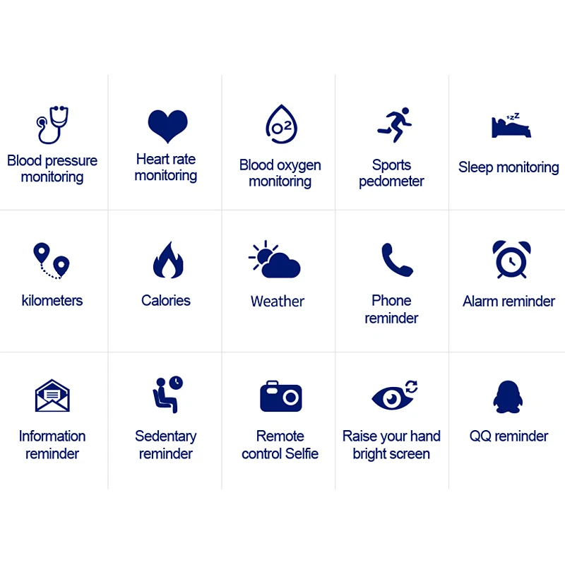 Feature:Fitness Tracker,Sleep Tracker,Message Reminder,Call Reminder,Auto Date,Complete Calendar,Heart Rate Monitor,Water Resistant,Alarm,Bluetooth,Week Display