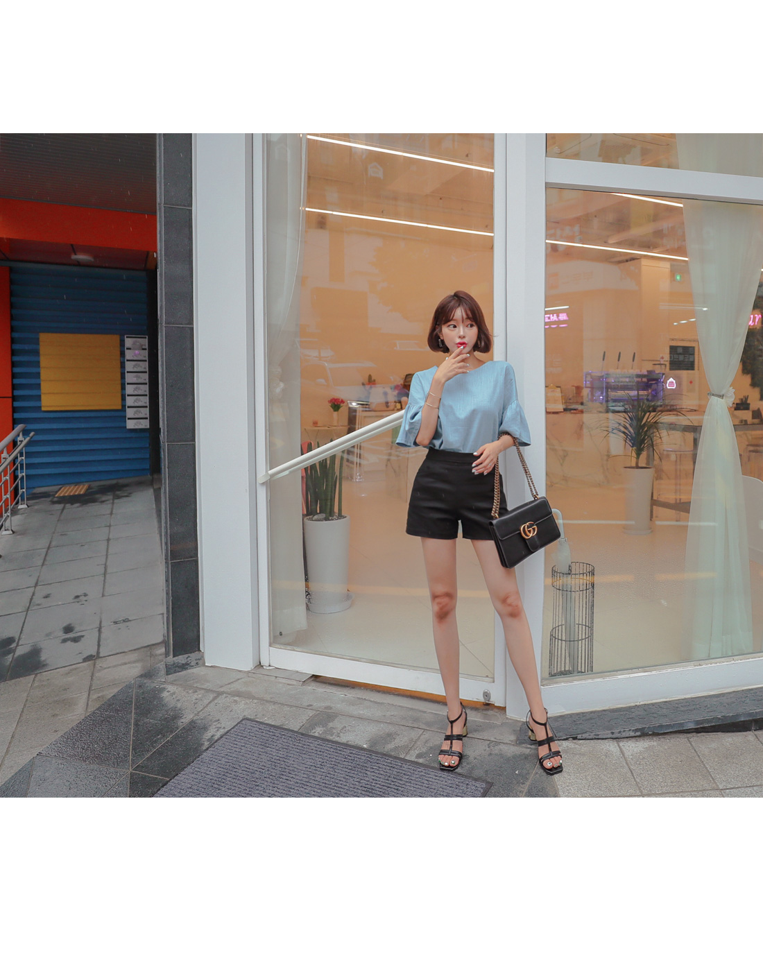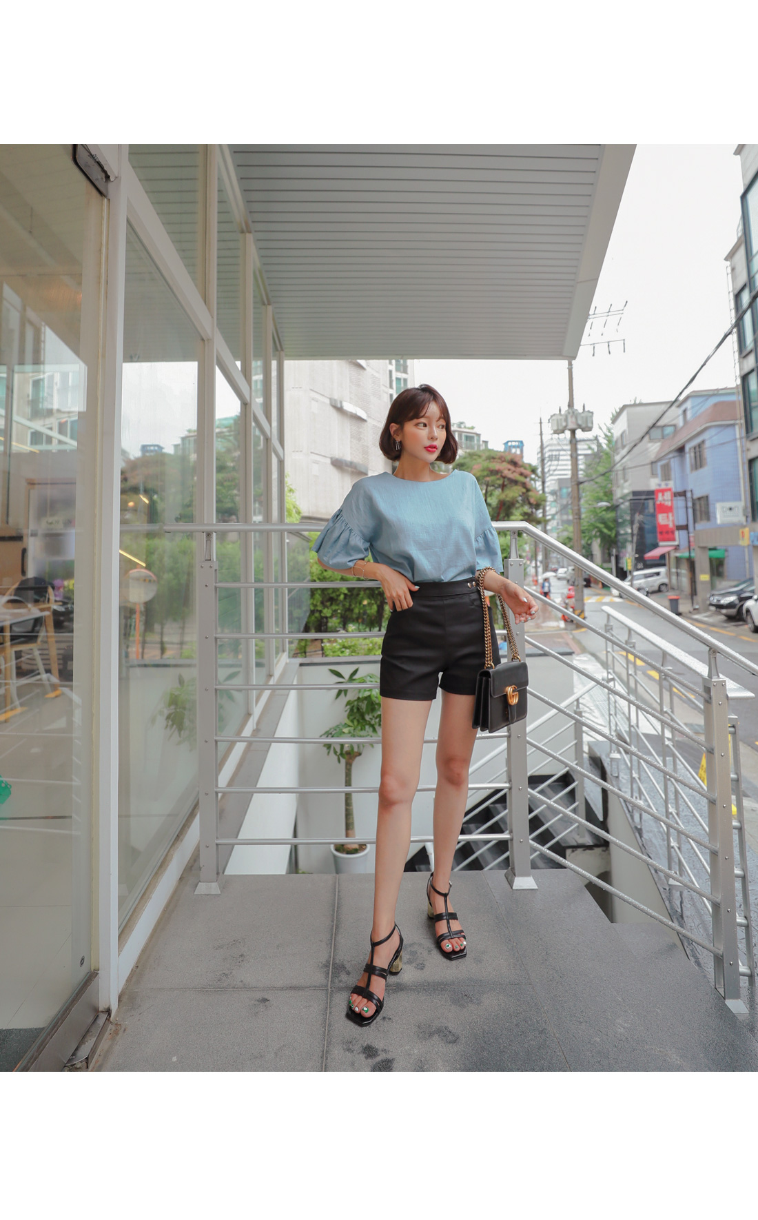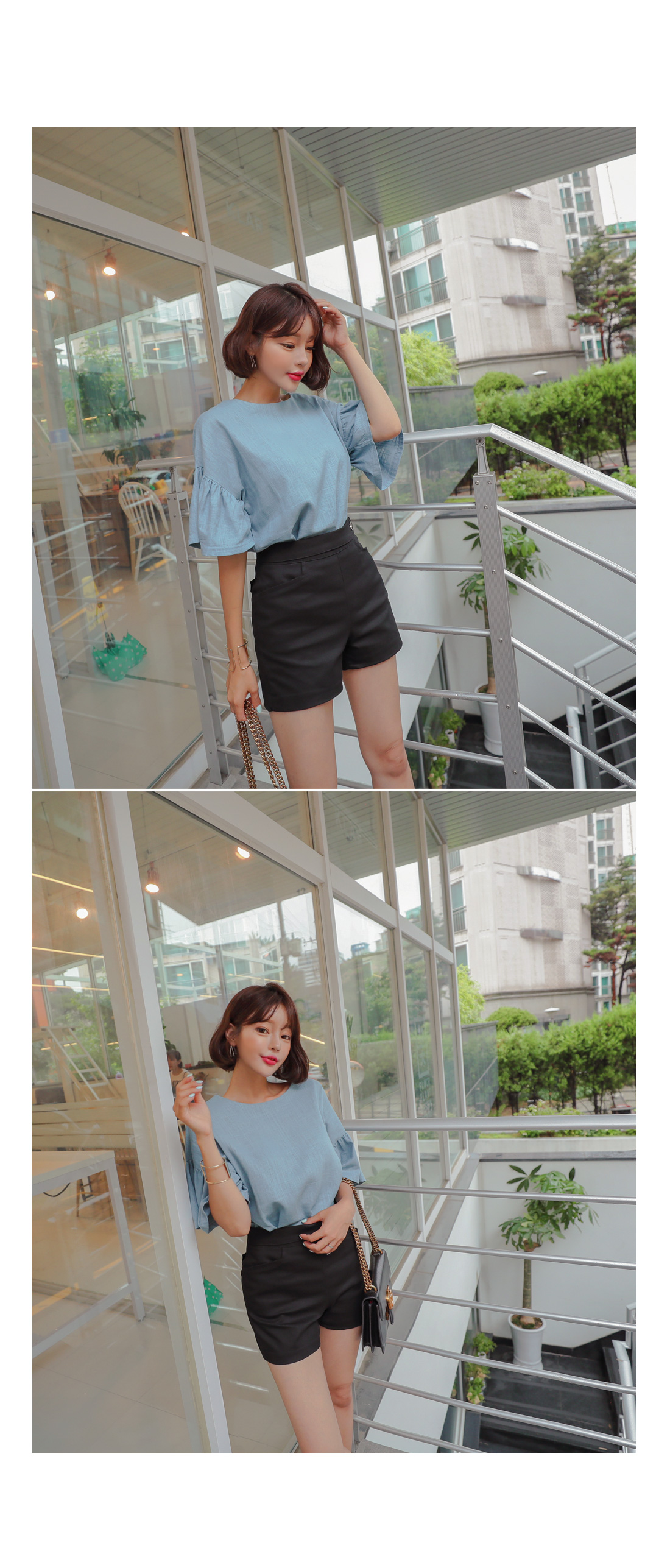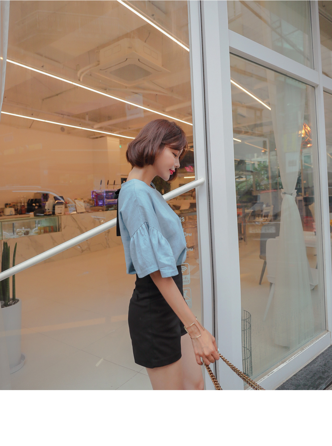 소매 셔링디테일이 러블리한 무드를 더해주었으며
