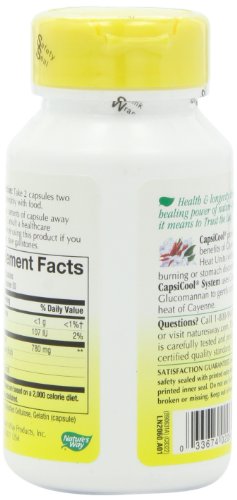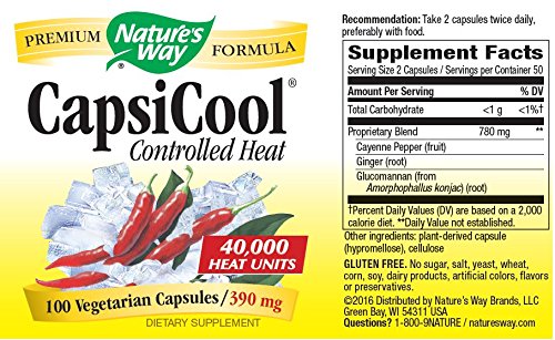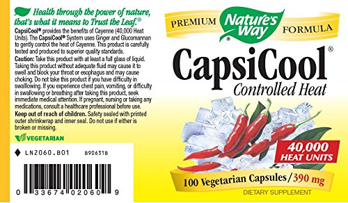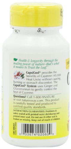 Studio : Nature's Way Publisher : Nature's Way Binding : Health and Beauty Product Description Cayenne with heat shield. Cayenne is blended in this formula with ginger root, which helps provide a buffering effect. The 40,000 HU "Certi-FIERY" Cayenne in CapsiCool is heat controlled through Nature's Way proprietary Heat Shield process. Cayenne is a blood-red warming herb that has an invigorating effect on several body systems. Nature's way Capsicool Cayenne. 0