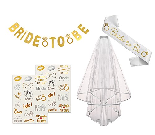 - Bachelorette party tiara decoration set includes 1 metal rhinestone tiara, 1 wedding veil with comb, 1 white customized bride to be sash,2 set pack of 17 bachelorette tattoo, and 1 glitter gold "bride to be" banner.