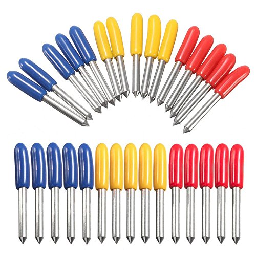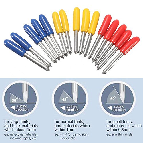 Studio : China Imported Publisher : China Imported Binding : Misc. Product Description Features: Application: ideal for Roland and most domestic and imported plotter Long life span Resistance, high hardness. Blades is imported stainless steel, through the grinding polishing processing, high precision, good lettering quality. Carbide tip with higher hardness (HRA93), higher hardness, greater strength, tip more sharper, cutting plotter lettering faster. Made of Aluminum alloy (surface oxidation), Tungsten steel(blade) Plotter Holder Size: 45*29 *11mm Cutter size: Handle diameter: 2mm, Overall Length: 22mm,Tip diameter: 1.0mm 3 Angles: 30° (Blue), 45°(Red), 60°(Yellow), 5pcs for each angles Package include: 5pcs x 30° blades 5pcs x 45° blades 5pcs x 60° blades 1pc x cutting plotter holder 0
