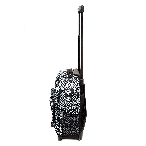 -. Binding : Apparel -. Brand : EVEREST -. Color : Multi -. Department : unisex-adult -. Feature : A small backpack on wheels: the convenience of a backpack, the ease of a rolling suitcase / Sturdy telescoping handle with a double-wheeled base / Multiple pockets with easy glide zippers for quick access / Side mesh pocket and double handles for easy portability / 13x6x17 -. Label : Everest Lage -Child Vendor Code -. Manufacturer : Everest Lage -Child Vendor Code -. PackageQuantity : 1 -. ProductGroup : Apparel -. ProductTypeName : BAG -. Publisher : Everest Lage -Child Vendor Code -. Studio : Everest Lage -Child Vendor Code -. Title : Everest Wheeled Pattern Backpack Backpack