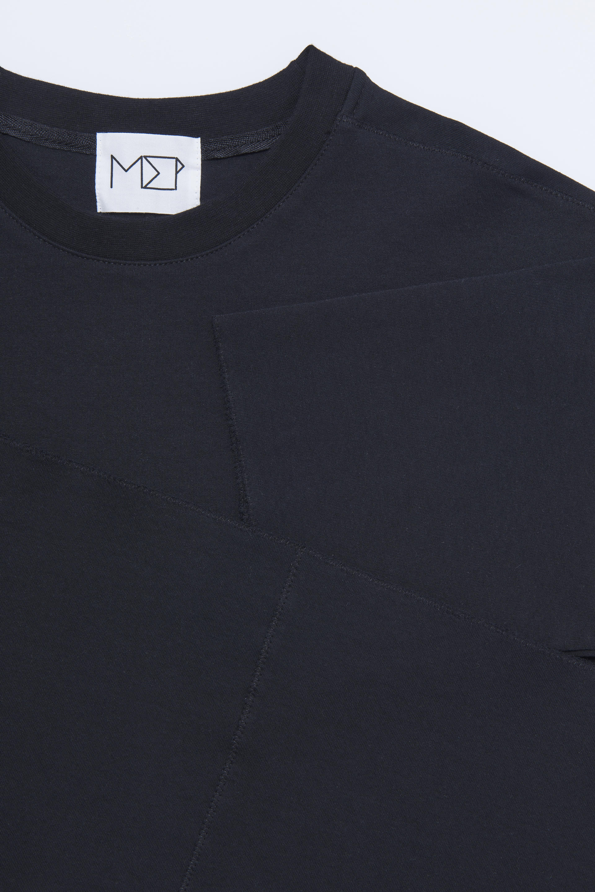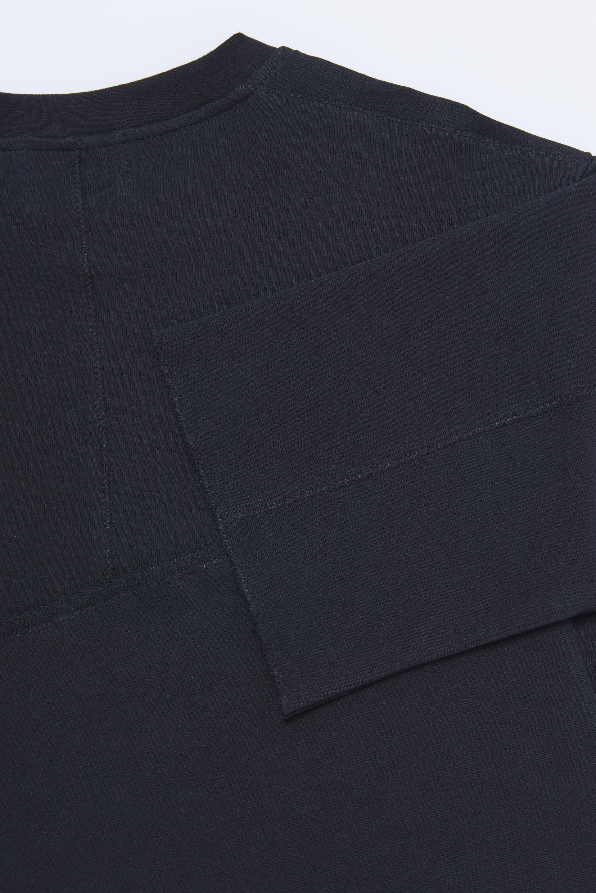 오버핏 디자인으로 절개선에 지그재그 자수 마감 디테일.