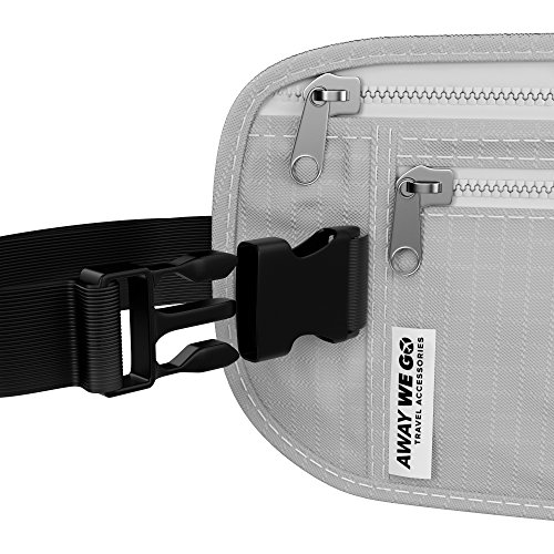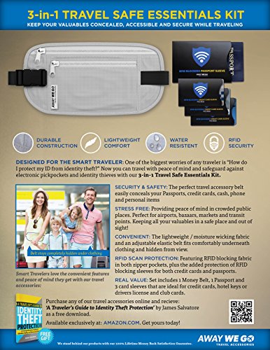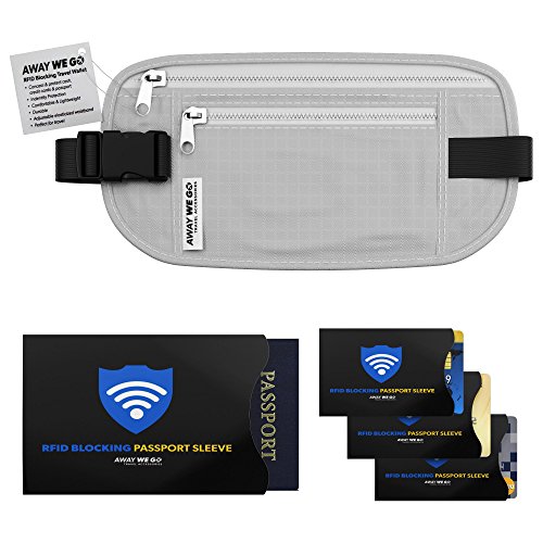 -. Brand : Away We Go -. Department : travel -. Feature : FEEL SECURE AND PROTECTED: This travel wallet easily conceals your Passports, credit cards, cash, phone and personal items. Designed with superior-quality RFID Blocking (Radio Frequency Identification Blocking) fabric to safeguard against illegal scanning of your personal data. This is the ideal money belt for traveling domestically or overseas and you will feel secure knowing your information is safe in this RFID blocking body wallet. / CONVENIENT: This lightweight passport holder belt set is worn hidden under clothing. Moisture wicking fabric and an adjustable elastic belt fits comfortably around your waist or across your chest underneath clothing and hidden from view. / STRESS FREE INTERNATIONAL TRAVEL: Providing peace of mind for the busy traveler in crowded public places. This hidden travel belt is perfect for airports, bazaars, markets and transit points. Keeping all your valuables in a safe place and out of sight! / QUALITY: All of the items in this set are designed with RFID blocking fabric. Our money belt & custom sleeves are sleek, durable, and easy to use. You will not find a better money belt for traveling. / REAL VALUE: Set includes 1 Money Belt, 1 Passport and 3 card sleeves that are ideal for credit cards, medical ID or drivers license and feature a 100% MONEY-BACK GUARANTEE - No Questions Asked Return Policy. -. ProductGroup : Apparel -. ProductTypeName : LAGE -. Size : Adjustable -. Title : Hidden Money Belt w/RFID Blocking 3 in 1 Travel Wallet & Passport Holder w/RFID Blocking Passport & Credit Card Sleeves