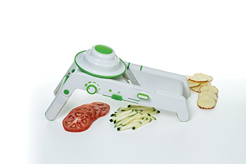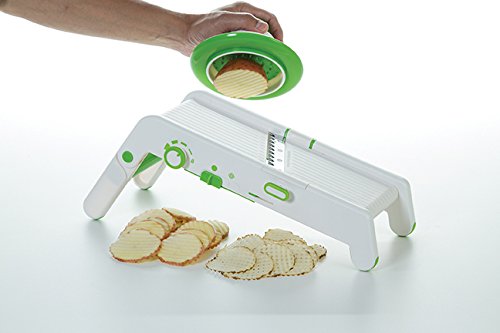 Slice, julienne and wave cut your favorite produce and then fold in the rear foot for handy, compact storage. This mandolin offers four slicing thicknesses, two julienne (thin and French fry), wavy and waffle cutting options