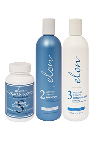 This replenishing treatment system features ELON Moisture Therapy Shampoo, ELON Moisture Therapy Conditioner, and a daily ELON Matrix 5,000 nutritional supplement for hair rejuvenation. Designed specifically for over-processed, brittle, weak and dry hair where each formula targets the main causes of unhealthy hair in order to achieve glossy and luxurious locks.Feature