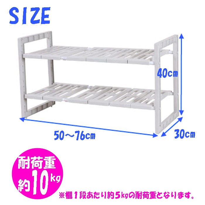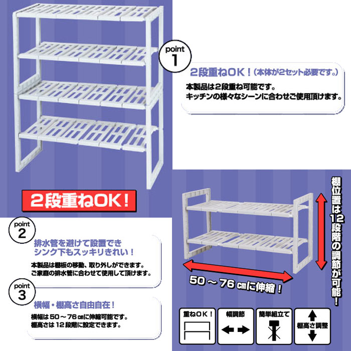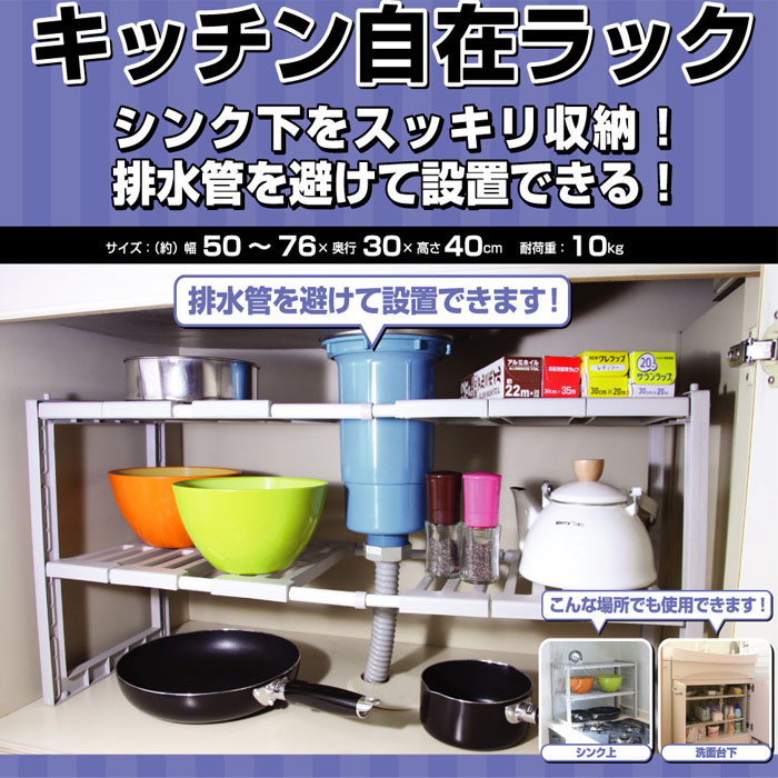 ≪商品詳細≫*シンク下をすっきり収納できます。*排水管を避けて設置可能*2段重ねOK(本体が2台いります)*横幅。高さ調節可能*洗面台下などにも使用できます。【メーカー】ILC【商品サイズ】W50~76cm×D30cm×H40cm 【耐荷重】約10kg(棚一枚約5kg)【材質】パイプ:スチール鋼管粉体塗装/棚板・脚部・固定ネジ:PP樹脂 【原産国】 中国