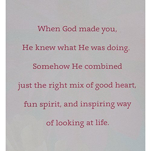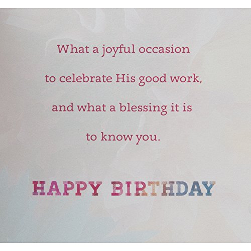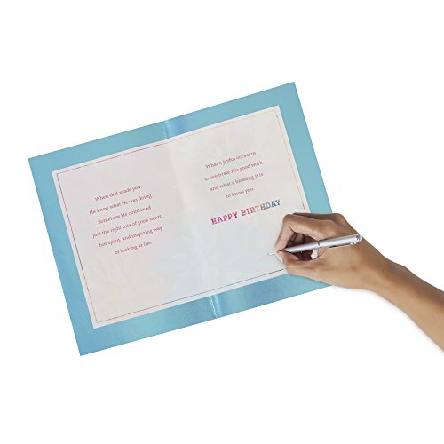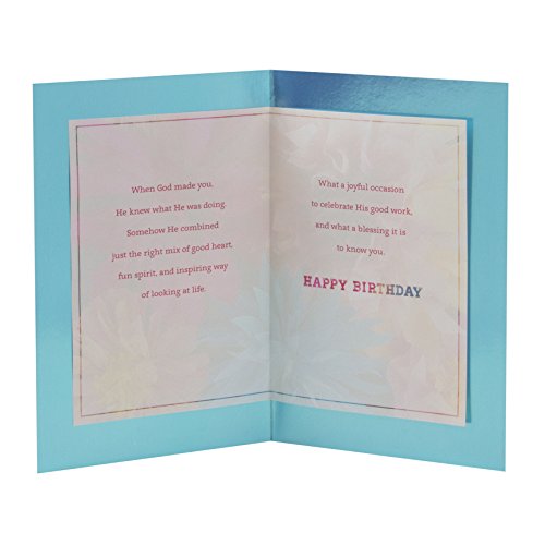 Studio : Hallmark Marketing Company, LLC (Office) Publisher : Hallmark Marketing Company, LLC (Office) Binding : Office Product Product Description Honor your family, friends, and others on their birthday with this card designed with red and blue lettering on a frosted background over an image of red and blue flowers. The message on the front of the card reads, "Be blessed Be grateful Be celebrate-ful." Open the card to reveal the inside message, "When God made you, He knew what He was doing. Somehow He combined just the right mix of good heart, fun spirit, and inspiring way of looking at life. What a joyful occasion to celebrate His good work, and what a blessing it is to know you. Happy Birthday" The card measures 8.3 inches long by 5.8 inches wide made with high quality cardstock paper; an envelope is included. All Hallmark cards are made with paper from well-managed forests. Mahogany greetings help African Americans enhance emotional connections with family and friends, and are an authentic representation of what is most beloved and valued within African American culture. Hallmark was founded in 1910 when 18-year-old J.C. Hall arrived in Kansas City, Missouri, with a couple of shoeboxes of postcards under his arm and the American dream in his heart. Today, more than a century later, Hallmark greeting cards are sold online and in nearly 40,000 retail stores across the globe and people continue to recognize the iconic Hallmark brand as "the very best." 0