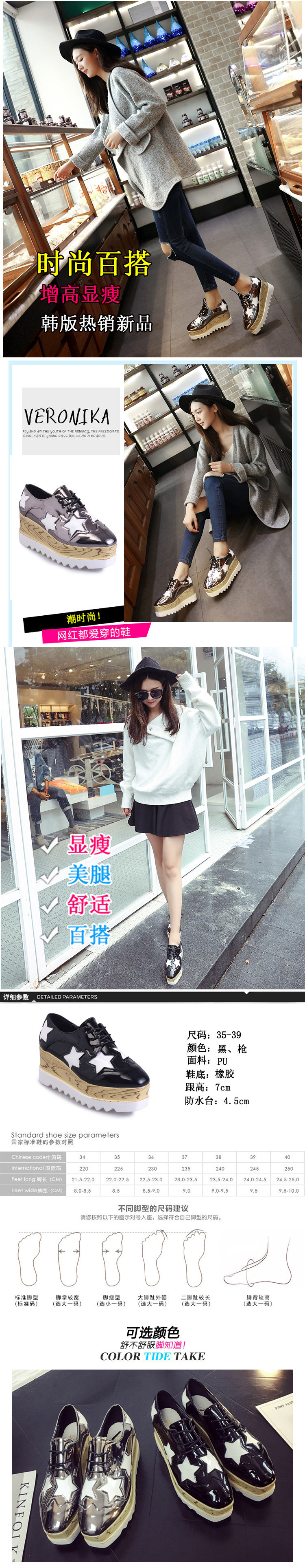 建议:脚胖脚宽脚背厚的MM请拍大一码!With the high: 7cmSize: 35-39 (standard code)Recommendation: foot fat feet wide foot instep MM please take freshman yards!
