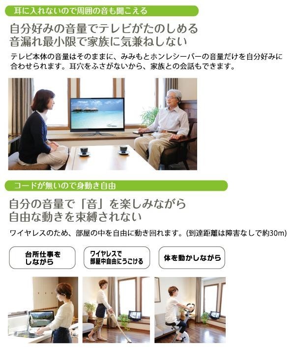 「みみもとホンTV」は自分の音量で「音」を楽しむ事ができます。耳穴をふさがないから、家族との会話はもちろん周囲の音へも気付けます。また、ワイヤレスのため、部屋の中を自由に動き回れます。 |