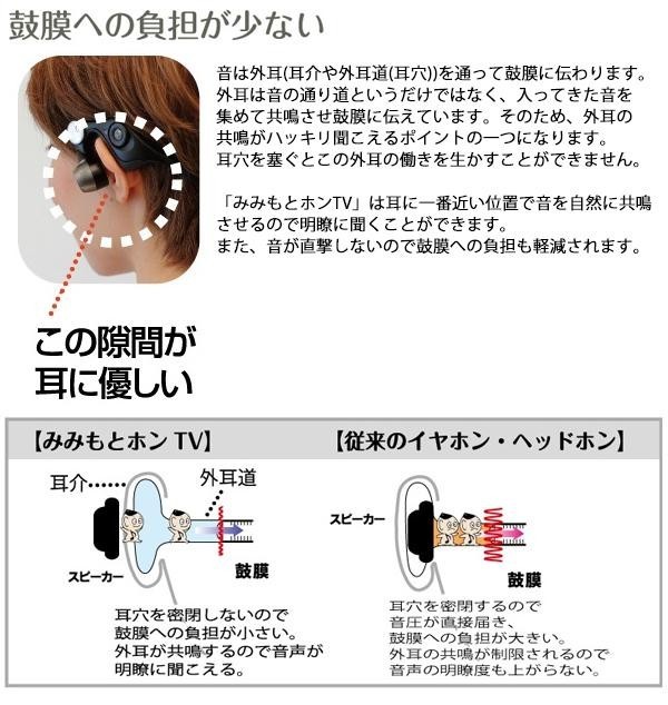 | 「みみもとホンTV」は自分の音量で「音」を楽しむ事ができます。耳穴をふさがないから、家族との会話はもちろん周囲の音へも気付けます。また、ワイヤレスのため、部屋の中を自由に動き回れます。 |