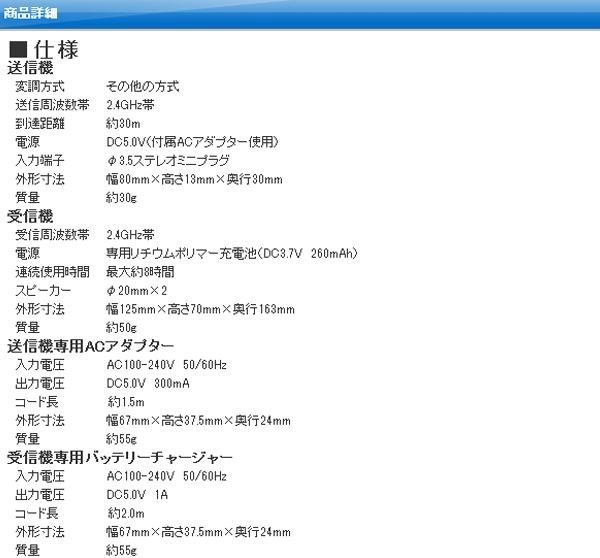 | セット内容 | 送信機、受信機、送信機専用ACアダプター、受信機専用バッテリーチャージャー、プラグアダプター、送信機固定シート、充電用フック、取扱説明書(保証書(1年)付) |