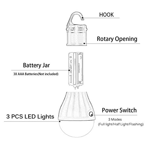 High Quality & Energy Efficient : The Portable Light made by high quality environmental friendly materials of ABS plastic,it's safe and reliable.There're 3 LEDS(1.5W),High-setting 180 lumens for maximum brightness that easily illuminate the whole tent,IP45 waterproof resistant,could be put in outdoor and indoor, the camping lamp is designed to save energy with dimmer control feature.