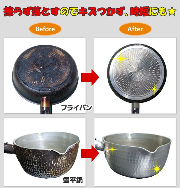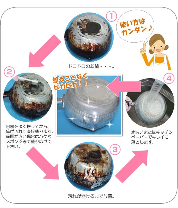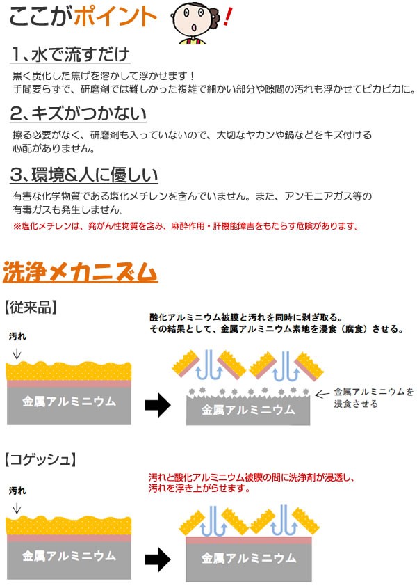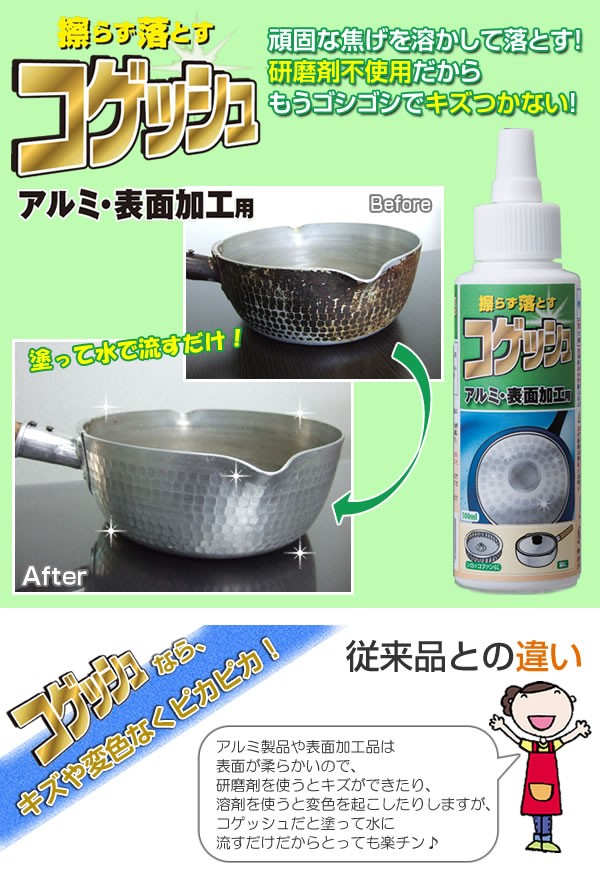 | <h1>ついに出ました『擦らず落とすコゲッシュアルミ・表面加工用』!!アルミなどの調理器具は市販の洗剤や研磨剤に対して耐性が弱いため、油汚れや焦げ汚れを落とすのに使用すると変色したり傷が付きます。コゲッシュなら汚れだけに反応するから、傷や変色の心配がいりません♪塗るだけの簡単作業で忙しいママも楽ちん★焦げを落として本来の輝きに。</h1> |