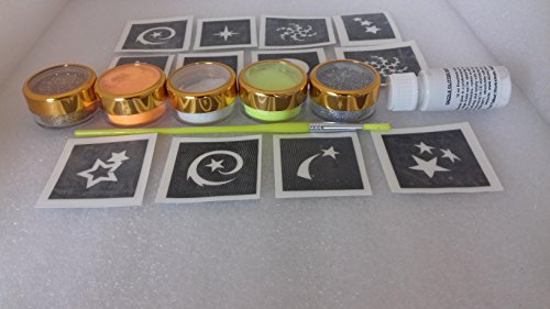 Studio : Body Art Desire Publisher : Body Art Desire Binding : Toy Product Description star themed mini tattoo stencils set include 30 stencils 5 glitter colors Mini small size - approx. 2.5 cm x 2.5 cm. (1" x 1"). A really good range and most can be used many times over. Includes 5 glitter colors, 1 pot of 14 ml prosaide body glue adhesive, 1 brush and instruction sheet. Ideal for birthday present, fundraising events, children's parties or adding to your entertainment business as a new avenue! 0