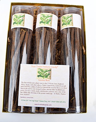 -. Binding : Misc. -. Brand : True Treats Historic Candy -. Feature : Pure licorice root / Chew for the licorice flavor - sold as candy in the the 19th and 20th century candy stores / Comes in three individual tubes,sealed for freshness- easy to store, easy to carry, easy to give as a gift. / Containers are in a box with the history on a tag from True Treats' food researcher / Arrived in North America in the 1600s, can also be used as a spice and tea -. Label : True Treats Historic Candy -. Manufacturer : True Treats Historic Candy -. ProductGroup : Grocery -. ProductTypeName : GROCERY -. Publisher : True Treats Historic Candy -. Studio : True Treats Historic Candy -. Title : Licorice Root - Historic - All Natural