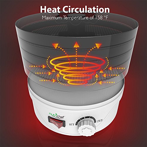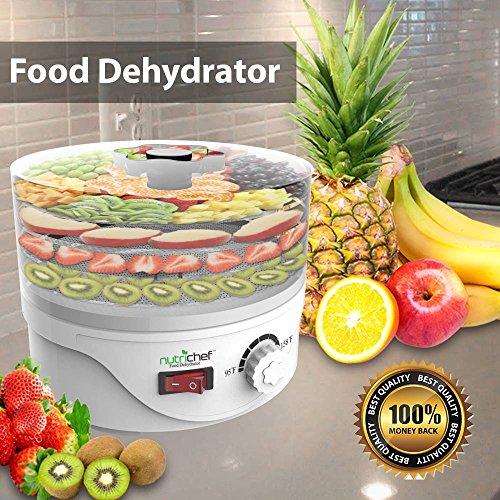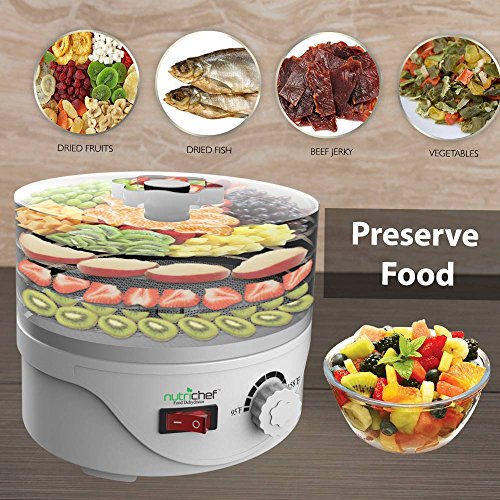 Simply insert your food into the trays and hit the switch to activate a new and healthier level of food preparation. The NutriChef Kitchen Dehydrator effectively works to remove moisture, drying your food and reducing spoilage. The multi-level trays allow for enhanced air-flow that dehydrates for prolonged food shelf-life & preservation. Your food will last longer and the removal of moisture content is far more beneficial than canning or freezing. Dehydration with NutriChef retains up to 97% of the food's nutritional value and is scientifically tested to make your food last longer -- and best of all, it still tastes great! Once dried, your food will retain original vitamins, minerals and flavor! The simple rotary control settings makes it even easier to prepare foods like meat, fish, poultry, fruits, vegetables and more! Save time, save money and save valuable cabinet space since the dehydration process shrinks your food, making it great for food storage or stocking up for the winter. It works great with a wide variety of food groups and is perfect for preparing healthy, oil-free veggie chips for the kids or hardy beef jerky for dad. Reduce spoilage and enjoy enhanced food preservation with the NutriChef Kitchen Dehydrator. NutriChef Electric Countertop Food Dehydrator, Preserver Jerky Maker.