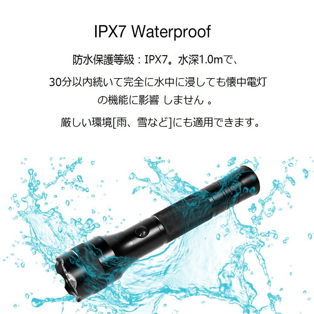 Test environment: 1.0 meters deep, continuing within 30 minutes and submerged completely in water will not affect the function of the flashlight.