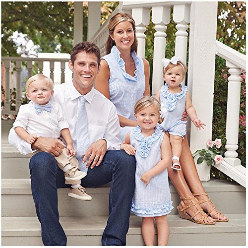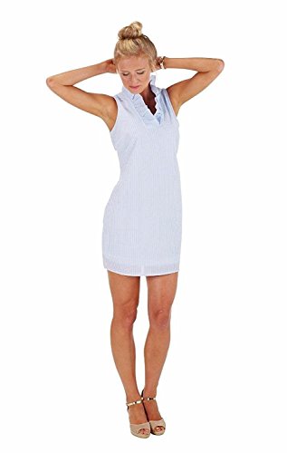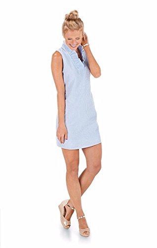 Super stylish, yet comfortable! This blue and white seersucker dress features a v-neckline that's accented with a wide ruffle. Mid-thigh length that can be worn with or without leggings. A perfect dress for any spring or summer function! Look at our Mommy & Me Seersucker girl's dress too! Great dress to coordinate with your little one for that "just like Mom" look! Measures approximately 35" from shoulder to hem on size small.Feature