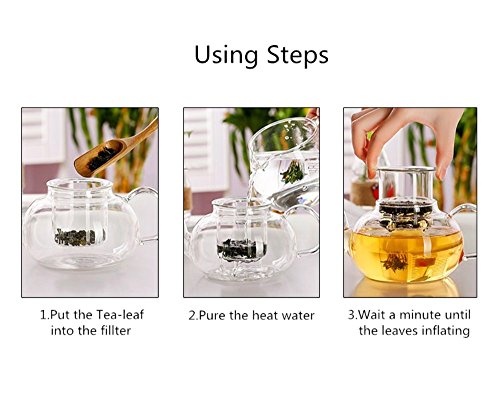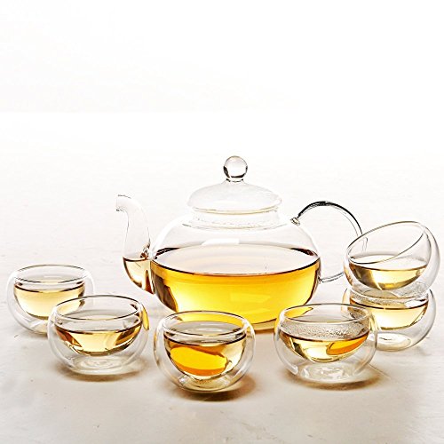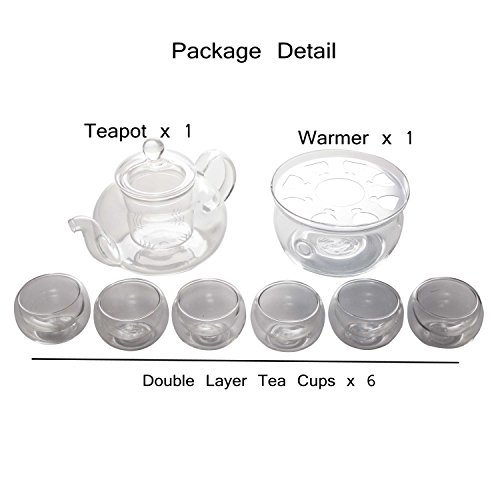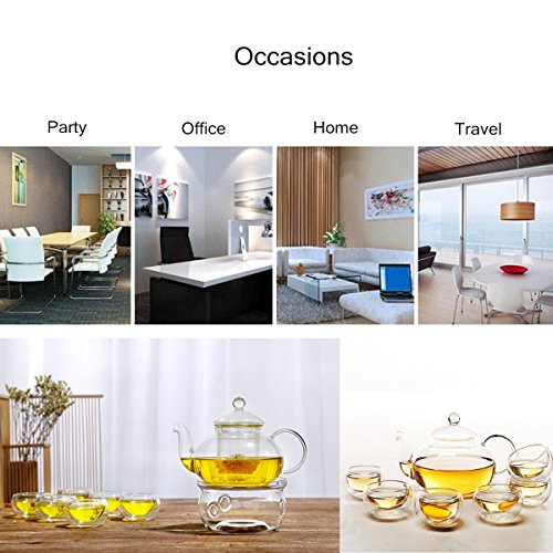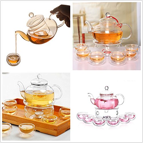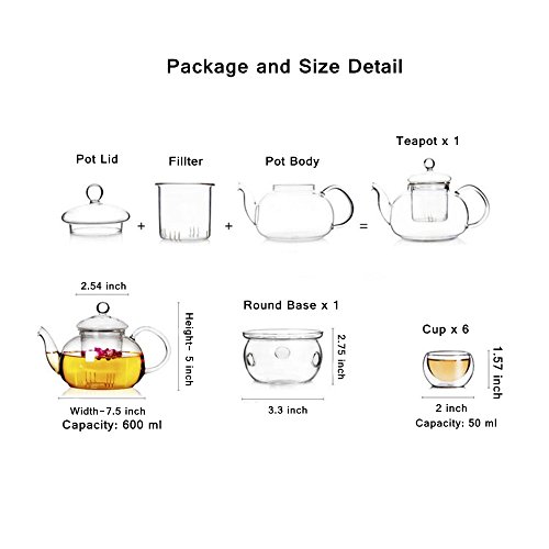 Specification: Package Included: 600ML Teapot x 1, Round Warmer x 1, Double Layer Tea Cups x 6. Weight: 0.92kg. Size Description: Warm Tip: The product size is measured by hand that may be some error, please refer to the actual product. Teapot :Height-5 inch,Width-7.5 inch, Teapot Mouse Diameter-2.54 inch,The Base Diameter-4 inch. Cup:1.57 x 2 inch Warmer: 2.75 x 3.3 inch Occasions : Tea sets are suitable for Green Tea, Black Tea, scented tea, Oolong Tea, Puer Tea, Fruit Tea and so on.Teapot set is widely used in Home,Hotel,Business,Party,Office and Traveling. Care Instruction: 1.Don't hit the glass hard. Handle it gently. 2.Not use the strong PH detergent to clean the teapot, just clean the tea stain with glass cleaner or vinegar. 3.Tea set should be placed in a safe place to avoid broken down. 4.When the glass temperature rises, do not scrub with moisture cloth, do not put in damp place. Service: We strive to put our hundred percent to resolve your issues and try our best to achieve your satisfaction! 0 |