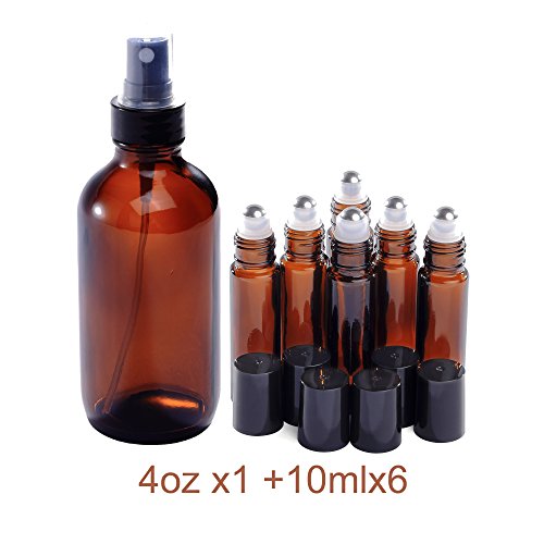 4oz and 10ml (1+6) Spray Bottle and Roller Bottle Set, Empty Refillable Glass Bottles, Stainless Steel Roll On Balls, Black Fine Mist Sprayer, for EO, Tonner,...