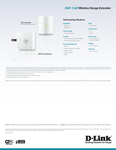 The Wireless Range Extender (DAP-1320) extends your existing wireless network coverage with the push of a button, delivering up to 300Mbps for whole-home coverage. Ideal for hard-to-reach areas like basements, upstairs bedrooms or outdoor areas, the compact Wireless Range Extender gives you performance where you need it most.Feature