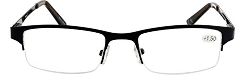 -. Feature : Reading glasses men strength 1.00. 2 Years Warranty And Friendly Customer Service / Stainless steel material Lightweight and Durability.The half-frame style and size fits most face shapes.Metal spring hinges strong and durable,help glasses adapt to face wear comfortable,Adjustable nose pads for added comfort.Great price and quality / Environmentally friendly material lens,aspherical wear-resistant transparent and clear,protect your eyes when reading.Standard pupillary distance and accurate magnification, to ensure that wearing will not be dizzy, can effectively help glasses to read.Sun readers for outdoor read and Uv Protection / Each pair glasses is equipped with exquisite cloth pouch for storage and protection.5 Colors(Black , Metal Gray, Brown, Gold and sun reader glasses).Each pair of readers glasses carefully selected to ensure quality / Product Size, Lens Width: 52mm/2.0", Lens Height: 31mm/1.2", Bridge: 18mm/0.7", Temple Length: 138mm/5.4", Total Width: 132mm/5.2". Weight: 0.9ounce/25g