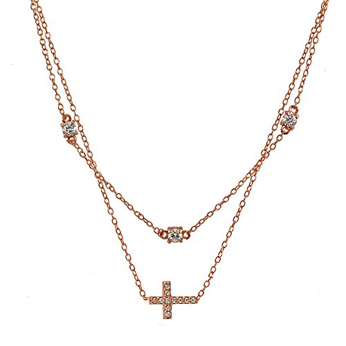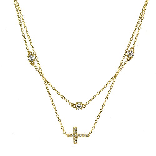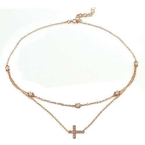 FEATURE - This attractive necklace features a thin choker chain and necklace; showcasing a fashionable layered style. There are 3mm cubic zircnoia stones stationed on the choker, and a cubic zirconia studded sideway cross dangling off the necklace.