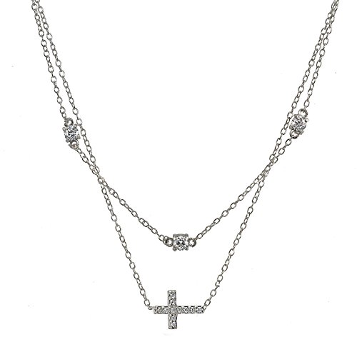 This attractive necklace features a thin choker chain and necklace; showcasing a fashionable layered style. There are 3mm cubic zircnoia stones stationed on the choker, and a cubic zirconia studded sideway cross dangling off the necklace. The necklace is 13" long plus a 4" extender. It is crafted of sterling silver.