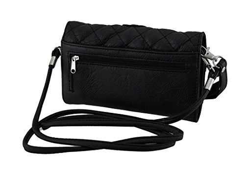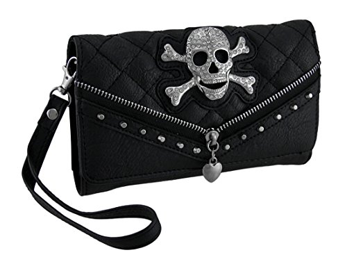 Studio : Zeckos Publisher : Zeckos Product Description This rhinestone skull quilt stitched wallet with removable straps measures 7.5 inches long, 4 inches high, and 2 inches wide. It has a leather-textured vinyl construction with a polyester fabric lined interior, rhinestone covered skull and bones, quilt stitching, zipper detail, and gunmetal grey studs on the front for a soft yet edgy look. It has 9 card slots, 3 clear-view ID slots, 5 open pockets, a zippered change pouch inside, and a zip pocket on the back offer plenty of storage and organization. It includes a detachable shoulder strap that offers a 22 inch drop and wrist strap for when you're on the go. 0