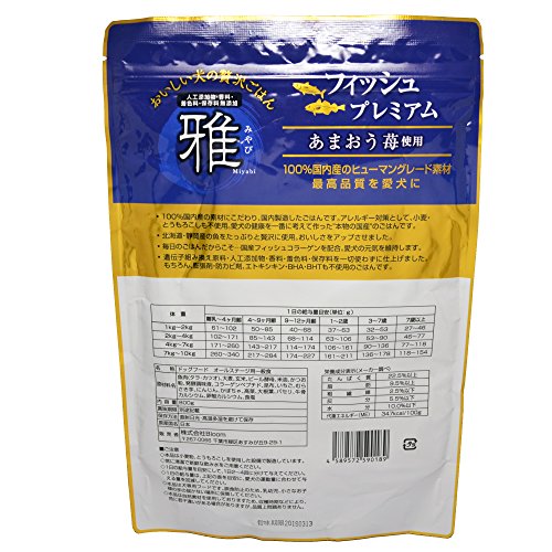 原材料:魚肉(タラ・カツオ)、大麦、玄米、ビール酵母、米油、かつお粉、発酵調味液、コラーゲンペプチド、昆布、いちご、むらさき芋、にんじん、かぼちゃ、高菜、大根葉、パセリ、牛骨カルシウム、卵殻カルシウム、食塩