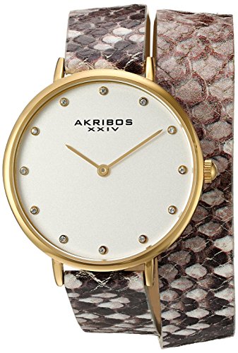 -. Title : Akribos XXIV Women's Quartz Gold-Tone Case with Silver Dial and Swarovski Crystal Hour Markers on Beige Snakeskin Embossed Genuine Leather Double Strap Watch AK923YGGY