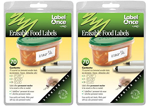 - 2-Pack label once food label starter kits; includes 2 permanent ink erasers, 2 permanent markers and 140 laminated labels in 3 sizes