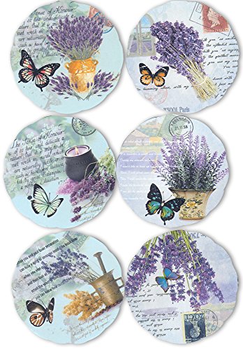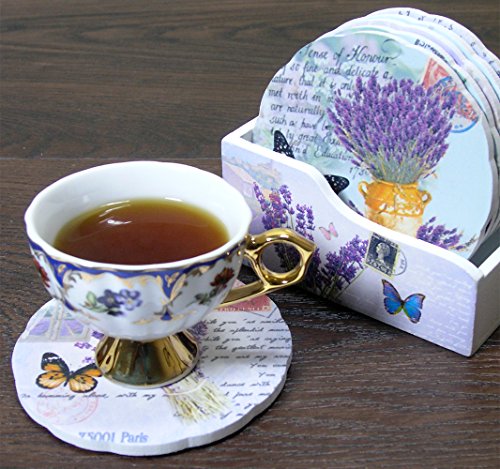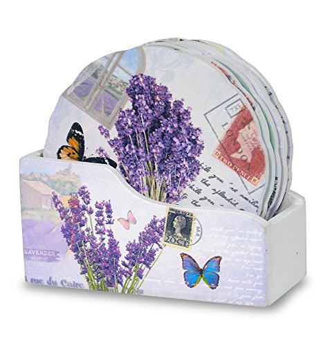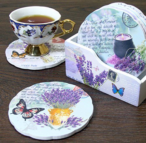 - DECORATIVE COASTER SET. Each coaster has a different inspirational saying with butterflies and purple lavender. SET OF 6 COASTERS WITH HOLDER. Perfect addition to any kitchen decor. Use them for your coffee, hot tea, pop, soda, wine, water or mixed drink.