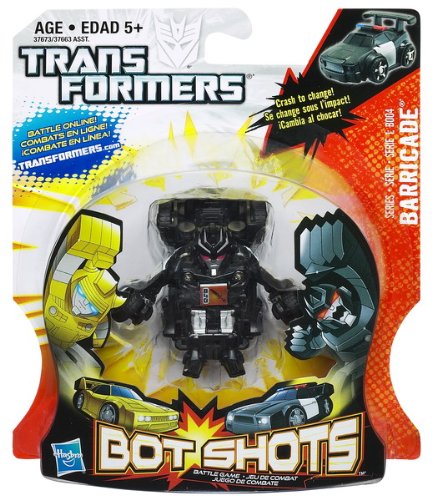 Dominate the BOT SHOTS game of strength and high-powered collisions with this fierce BARRICADE vehicle! Your vehicle has a Sword, Blaster and Fist power. Choose your vehicles power, and face off against an opponent. Now crash your vehicles into each other! If your vehicle converts to robot mode while your opponents stays in vehicle mode, you win! If neither vehicle converts, crash them again! If both convert, the vehicle with the highest power wins: Blaster beats Fist, Fist beats Sword and Sword beats Blaster. May the strongest BOT SHOT vehicle win!Includes vehicle.Series 1 B004 BARRICADE