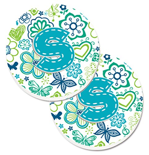 Caroline's Treasures Letter S Flowers & Butterflies Teal Blue Set of 2 Cup Holder Car Coasters CJ2006-SCARC, 2.56, Multicolor