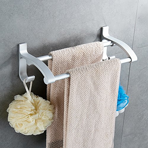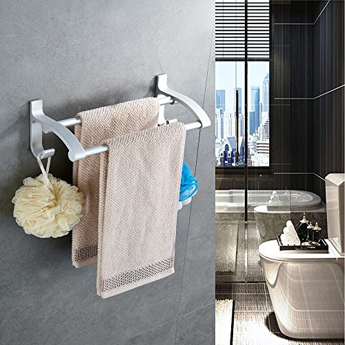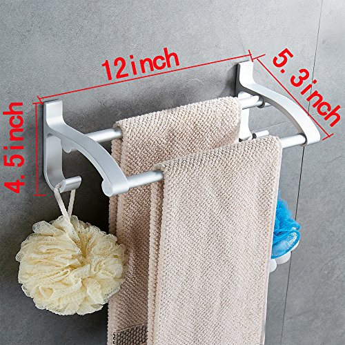 - 1) Elegant Design towel bar, two bars with 2 hooks to extend storage level. And two bars are not in same horizontal line, ensure towel to be dry faster.