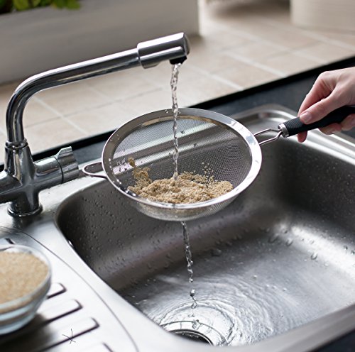 Fine Mesh: Its strainer is super fine and its mesh is ideally tight with approximately 16 holes per ince or 6 holes per centimeter that makes it perfect in rinsing Quinoa!