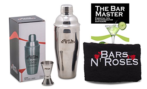 -. Feature : BEST BAR SET! - This bundle set by Bars N' Roses includes the best 25 OUNCE Cocktail Shaker with a Built-in Strainer Lid and Cap with a double-sided Jigger. It also comes with an 18-by-12 inch Terry-Cloth Towel and link for a Cocktail Recipe eBook. / BEST QUALITY! - We choose only superior quality materials to make our products. The complete shaker and jigger are made of stainless steel and will not rust. / BEST DESIGN! - Our sleek design tumbler with push on lid and cap that will not leak when shaking or turning upside down. The jigger holds both 1/2 and 1-ounce measurements for perfect mixing. With the Bars N' Roses logo stitched on the towel, it keeps the tools clean and dry. A myriad of cocktail and mixed drink options are in the easy-to-read recipe ebook. / BEST UPKEEP - Although the steel components are dishwasher safe, it is preferred to wash the cocktail shaker and jigger with lukewarm water to maintain their longevity. / BEST GUARANTEE - At Bars N' Roses, we offer a 100% satisfaction, money back guarantee. If you are not completely satisfied, we will do our best to rectify the problem.