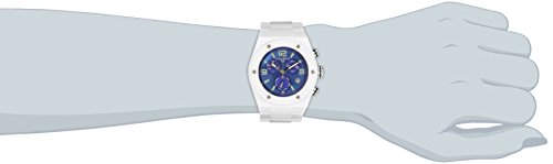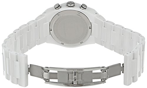 Blue Mother of Pearl Dial with Silver Tone and Pale Green Hands, Hour Markers and Arabic Numerals; Luminous; White Ceramic Bezel with Silver Tone Accents; Stainless Steel Pushers and Screw-Down Crown