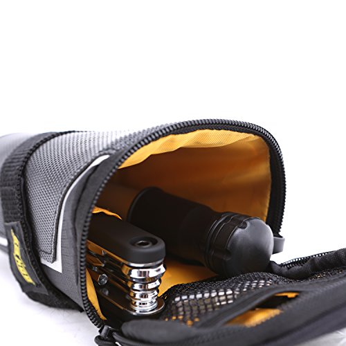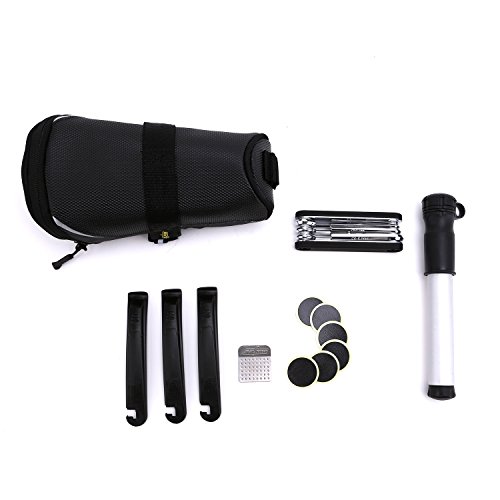 MULTI-FUNCTIONAL - Including a 7 in 1 tool kit, 3 tire pry bars, a mini bike pump and a non-glue patch kit which is useful to fix most problems of your bike and tire during riding. The saddle bag also can be used to carry other little items you want to collect.